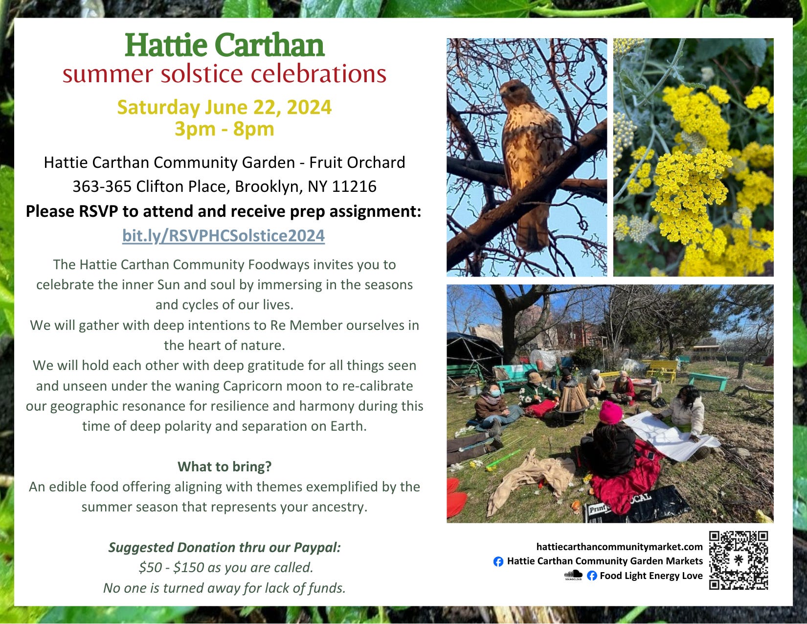 Join Spiritual consciousness Catalyst and Urban farmer Yonnette Fleming and The Hattie Carthan Healing Justice collective in our Summer Solstice process on Public Land. Our mission is to help folks trapped in urban cities understand the seasons and cycles of the Earth.